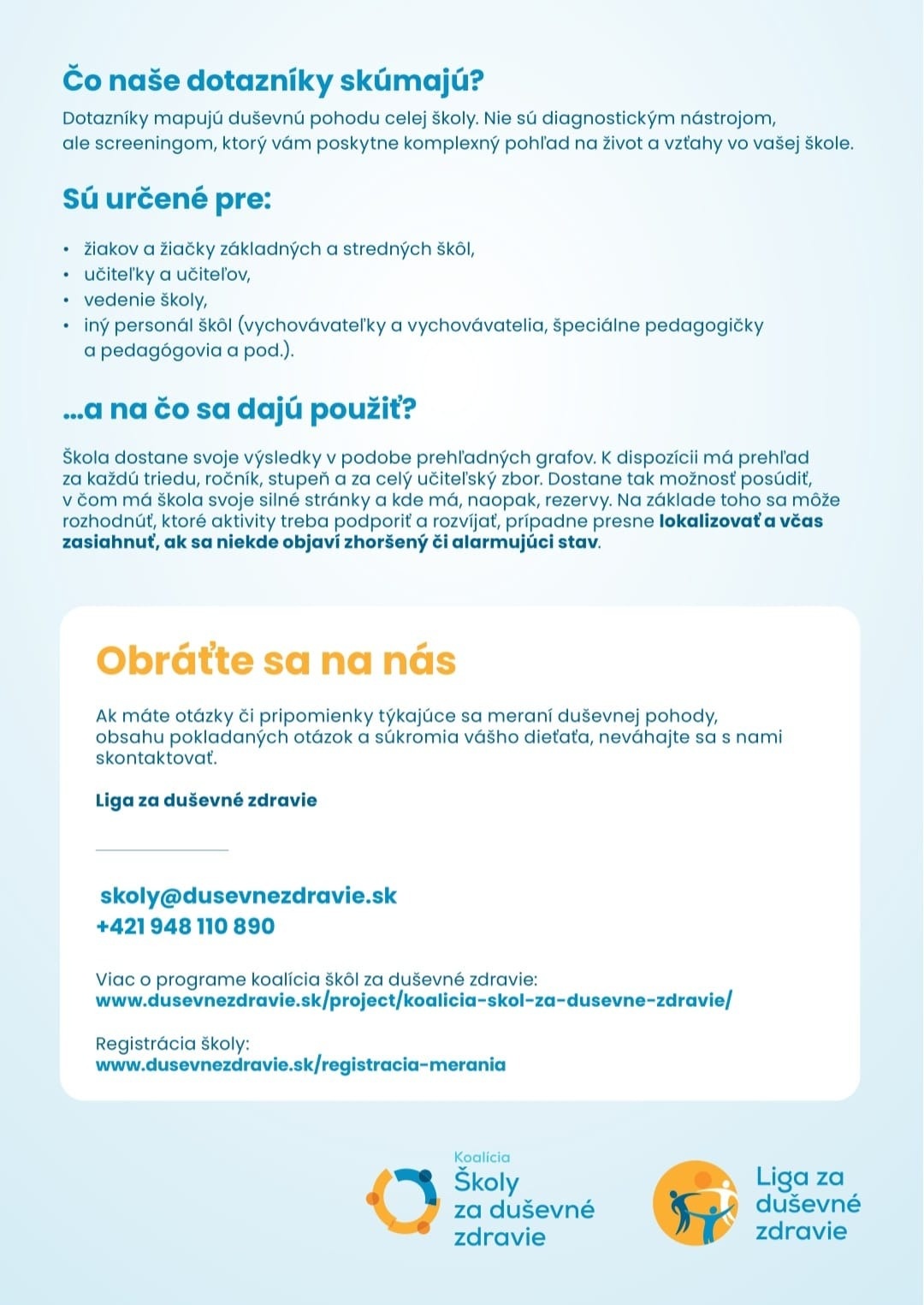 Koalícia Školy za duševné zdravie je združenie škôl, ktoré sa rozhodli pre transformáciu na duševne zdravé a psychologicky bezpečné prostredie. Naším spoločným cieľom je lepšia príprava mladých ľudí na kvalitný život, vyššia schopnosť učiť sa vedomosti a vo vzdelávacom procese prirodzene nadobúdať sociálne aj iné zručnosti.